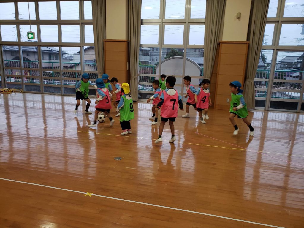 この年代から相手を見てドリブルする様にトレーニングしています。